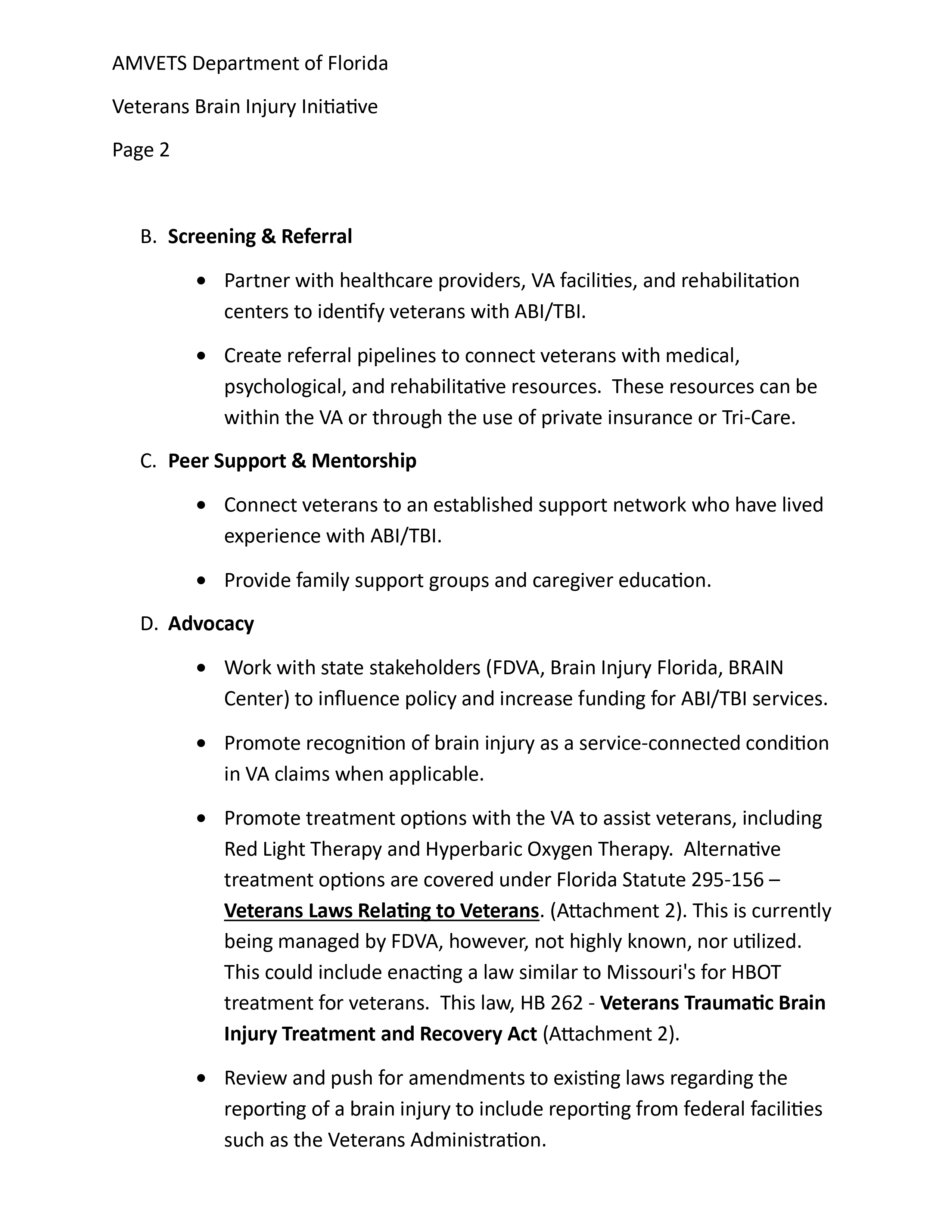 Through our mutual friend, Ritaann Schultz, we were asked to send you information about the new AMVETS Veteran Brain Injury Initiative. A motion was made and passed to form this as a committee under the Department of Florida during the recent state convention.