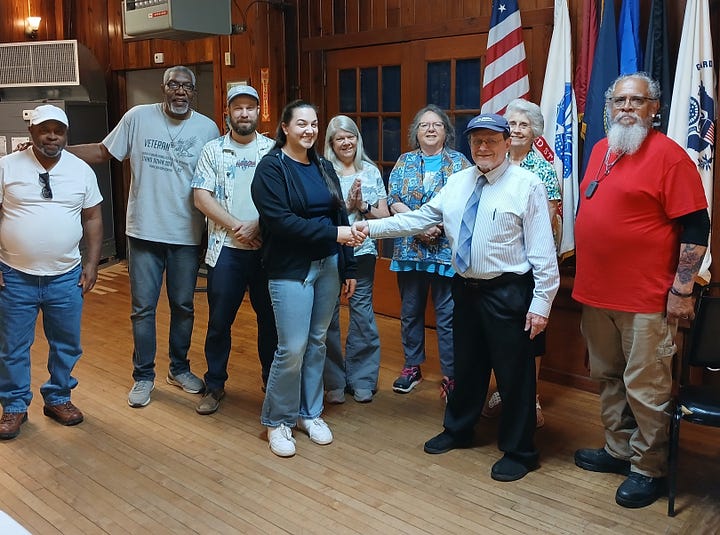 The walk-in legal clinic last Thursday involved our Team of 19 Volunteers (including 5 attys and an FSU Law student) working with 14 Veterans and family members (4/16/26) at American Legion Sauls Bridges Post 13. Plus we assisted others by phone and email. 5 Veterans were assisted by Elizabeth Revills from the Leon Tax Collector’s Office progressing toward reinstatement of their driver’s licenses. We also presented TVLC Commemorative Coins to 211 Veteran Eddie McMillian and also to FSU Law student Becca Vaillancourt for their many weeks of assisting Vets at the clinics.