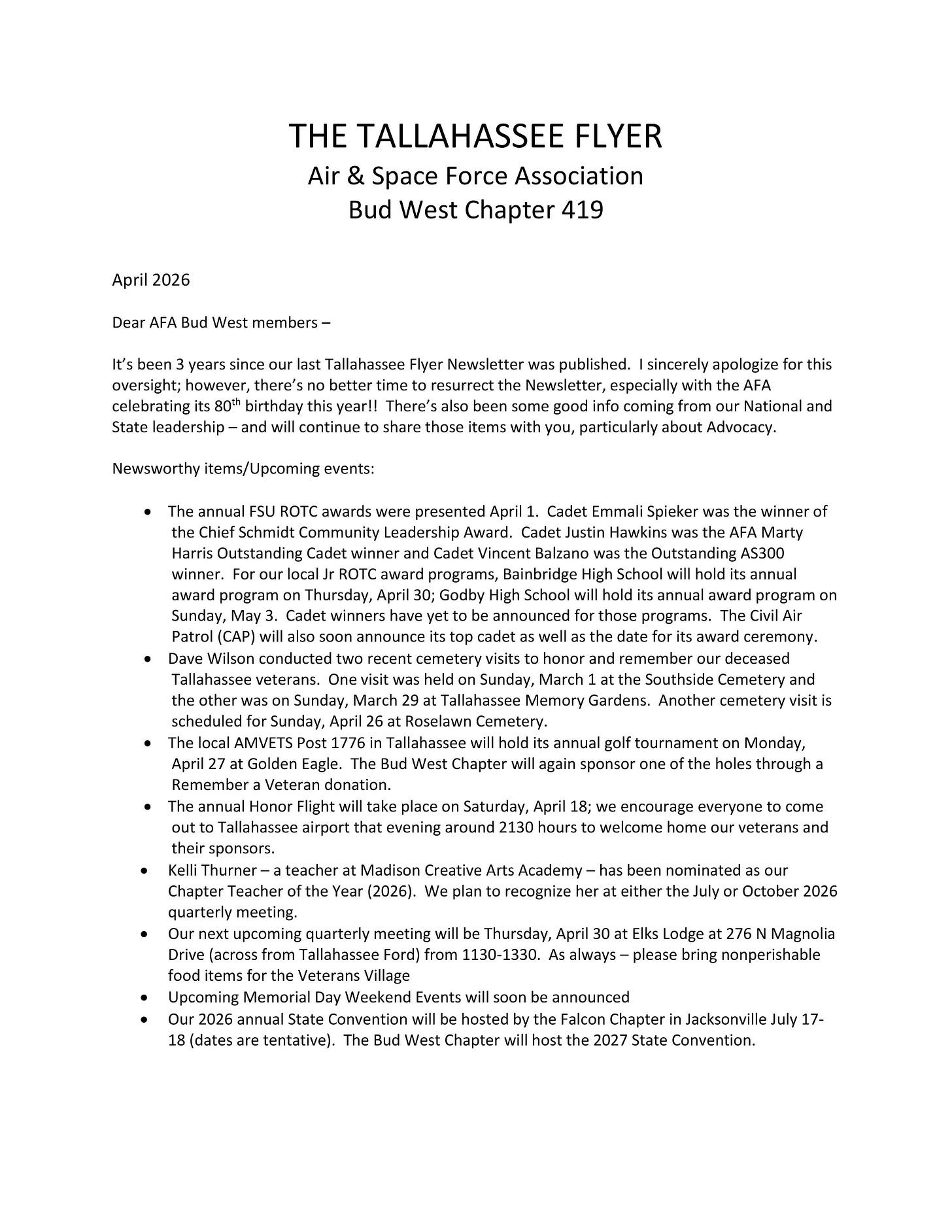 — Encourage other Veteran Organizations to share information about their activities and initiatives across Florida’s Big Bend region.