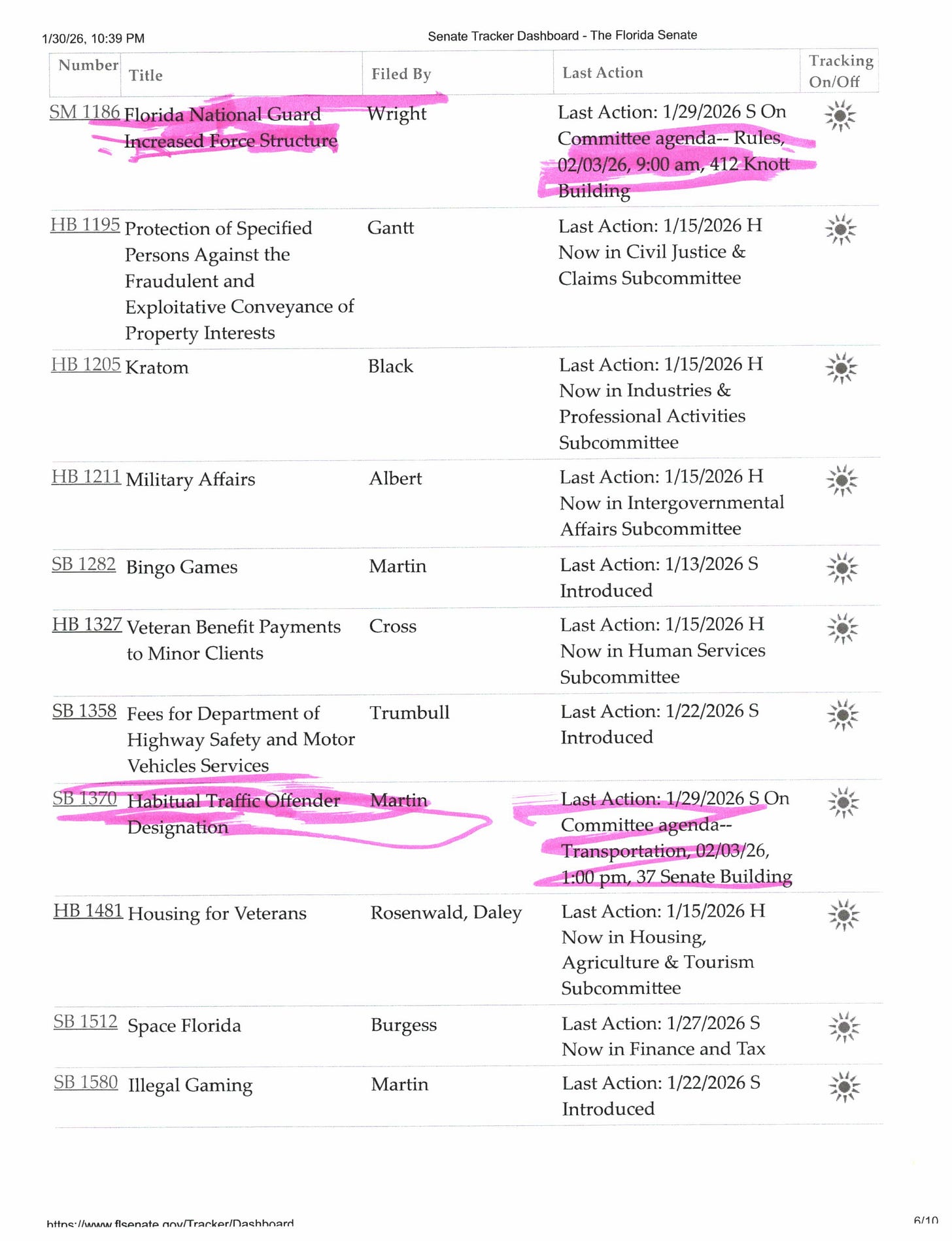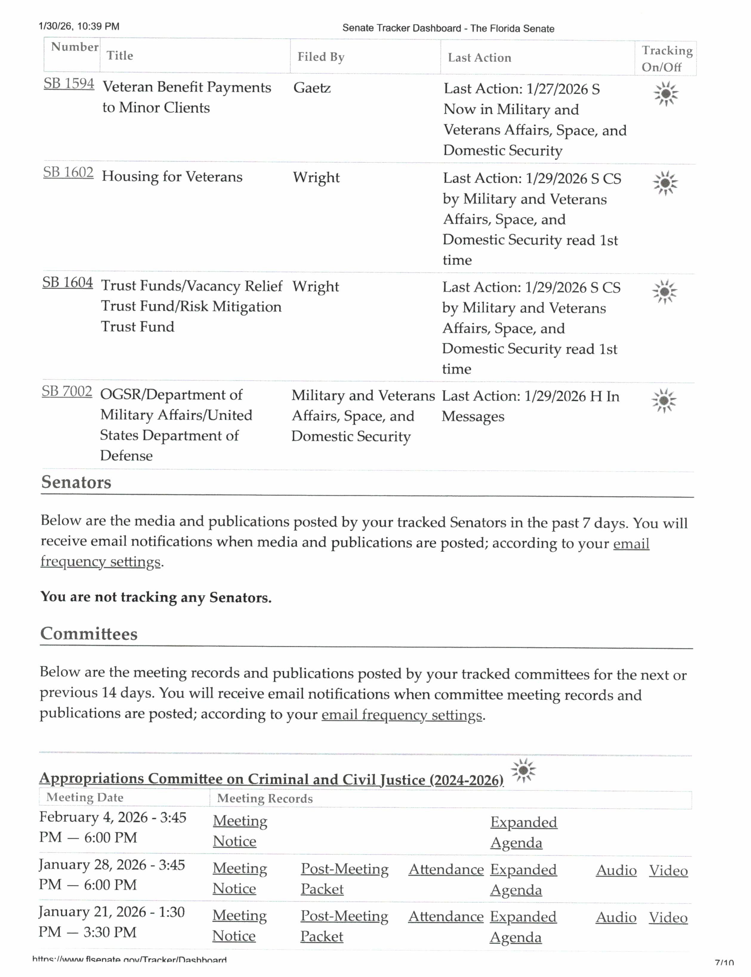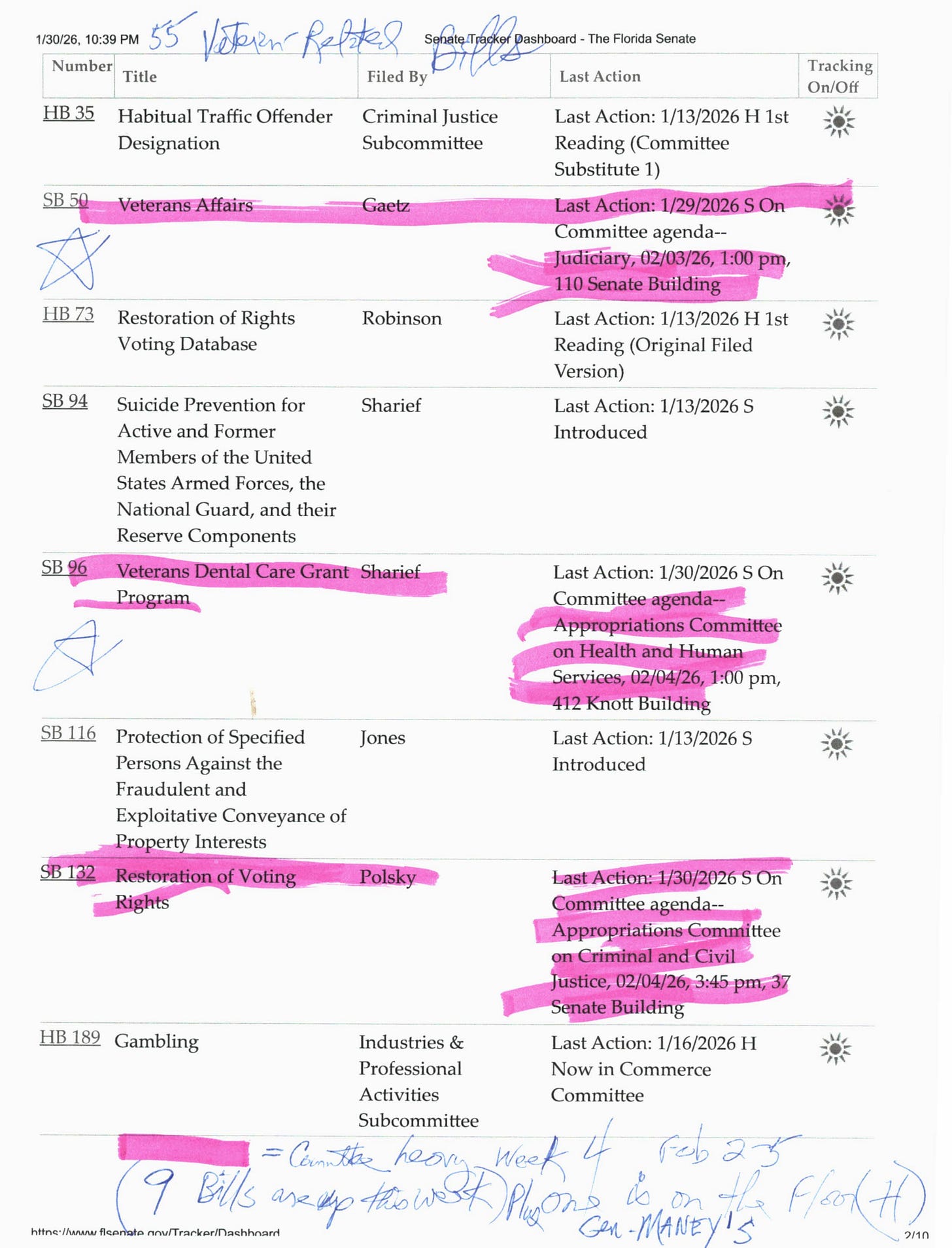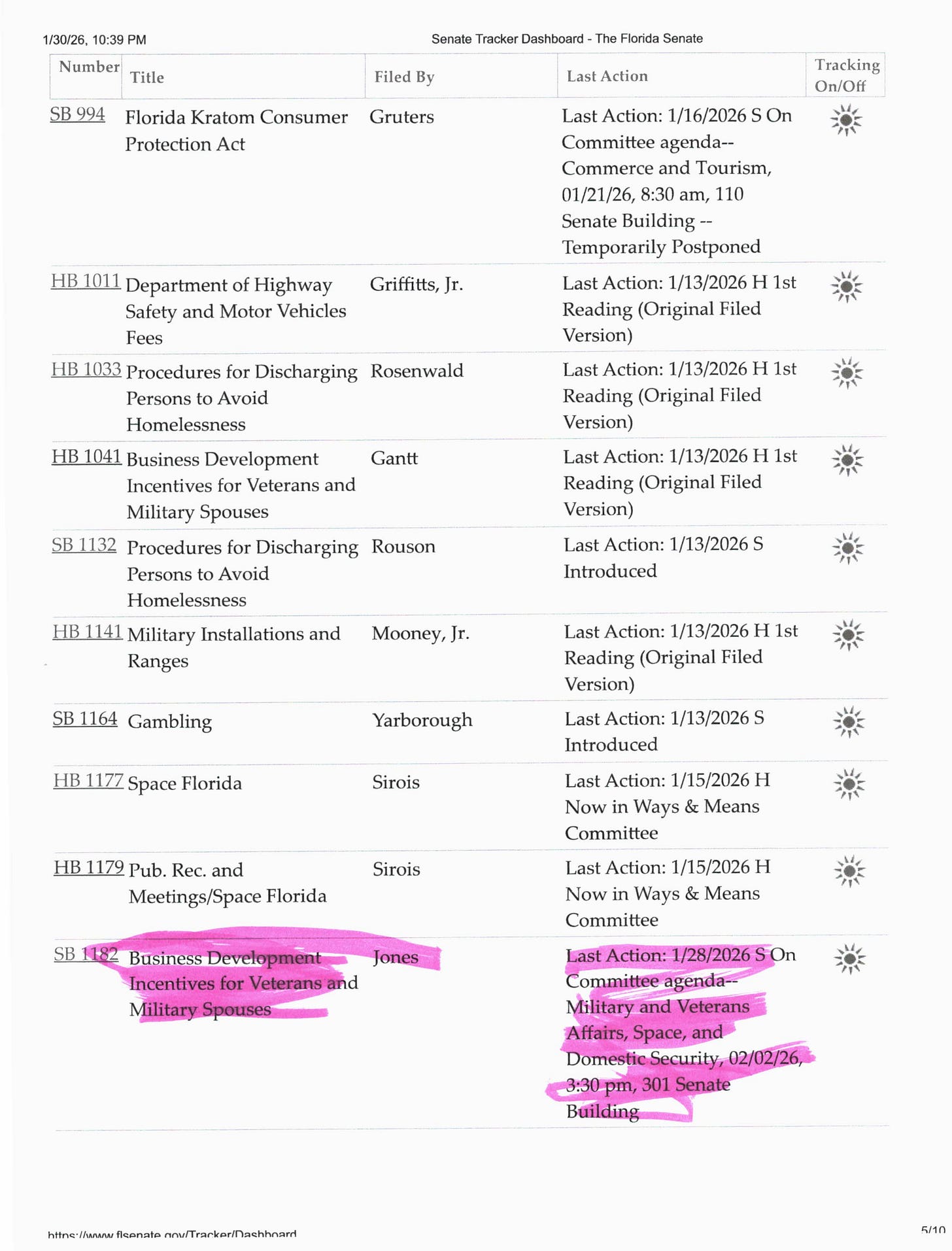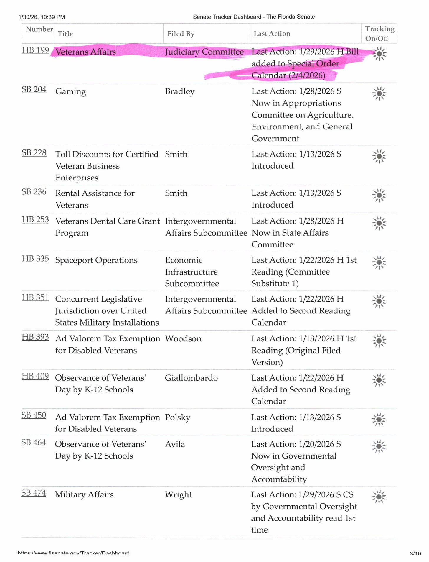 This is the week when legislative leaders are showing Veterans they want to help again. So we summarized which 10 bills (veteran or military-related) are up in committee (or on the floor so far). So I’m forwarding the email Susie was asked to communicate. Otherwise, see www.flsenate.gov (I omitted the calendars, since email might not send them and you know how to find them on the chambers’ websites. )
