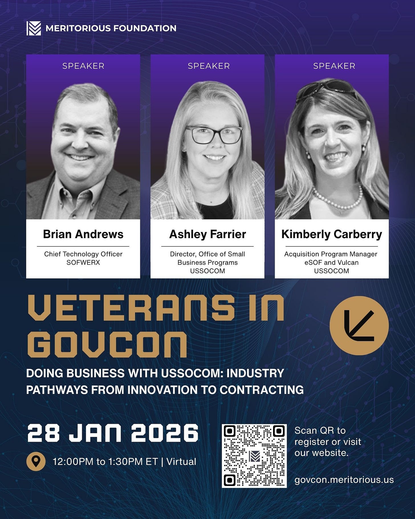 Whether you’re new to federal contracting or an experienced DoD partner, this Veterans in GovCon event breaks down how SOCOM identifies needs, works with industry, and transitions innovative solutions into operational use, while offering direct access to speakers at virtual tables for candid Q&A, deeper discussion, and meaningful networking.