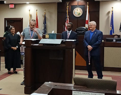 Veterans Treatment Court celebrated an inspiring Graduation Ceremony November 24, recognizing 11 successful Graduates! Congratulations, Shane Blodgett, Gregory Howard and David Gerourd, TVLC volunteers who were among the graduates (see photos). Visitors who did attend to witness the ceremony expressed appreciation for the opportunity. Former Vet Ct Judge Augustus Aikens returned to the Courtroom that day to deliver the keynote address to the Graduates, whose participation had extended from his jurisdiction to current Vet Ct Judge Lashawn Riggins. (also pictured above).